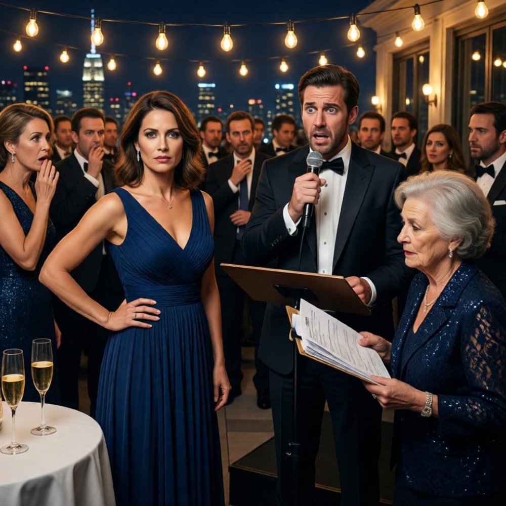 The envelope landed in front of me with the crisp, deliberate sound of a legal threat dressed up as celebration, and for one suspended second the entire rooftop seemed to hold its breath with me: the skyline glittering beyond the glass railings, the brass of the jazz quartet catching the amber light, the low expensive laughter of two hundred people who had come to toast success and had no idea they were standing at the edge of a public collapse. Manhattan shimmered below like a field of broken diamonds. The Hudson carried a dark ribbon of light in the distance. Somewhere farther downtown, a siren rose and faded. The Edison bulbs strung above the Harrove Hotel terrace threw every polished face into sharp relief. Champagne flashed. Silk moved. Phones glowed in idle hands. And across from me, with his fingers still hovering above the envelope as if he wanted credit not just for the gesture but for the emotional effect he expected it to produce, my husband looked exactly like a man certain the evening still belonged to him.