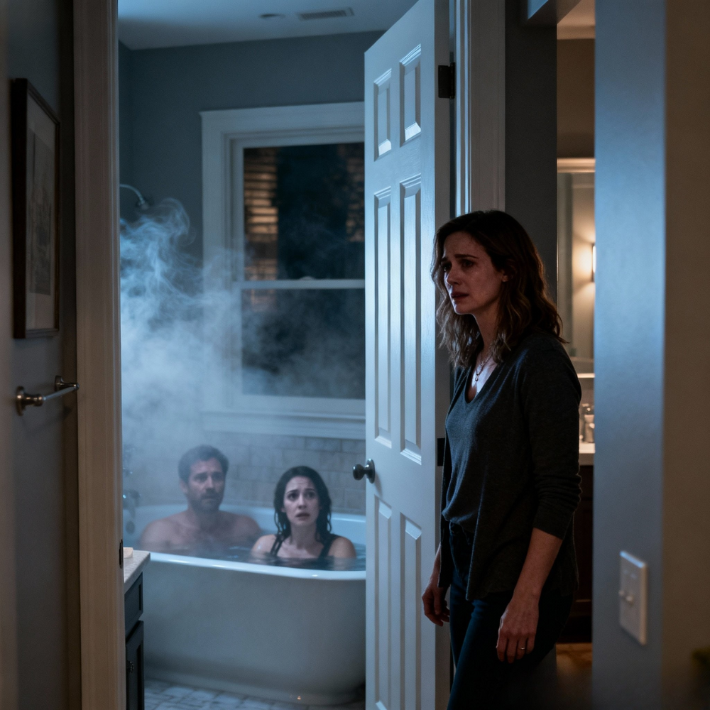 Thomas leaned back in my bathtub, arms stretched along the porcelain edge, his hair wet, his expression relaxed—until the moment he realized he was being watched. Eliza sat between his legs, her bare shoulders glistening, her fingers tracing idle patterns across his chest like she had the right to touch him that way.