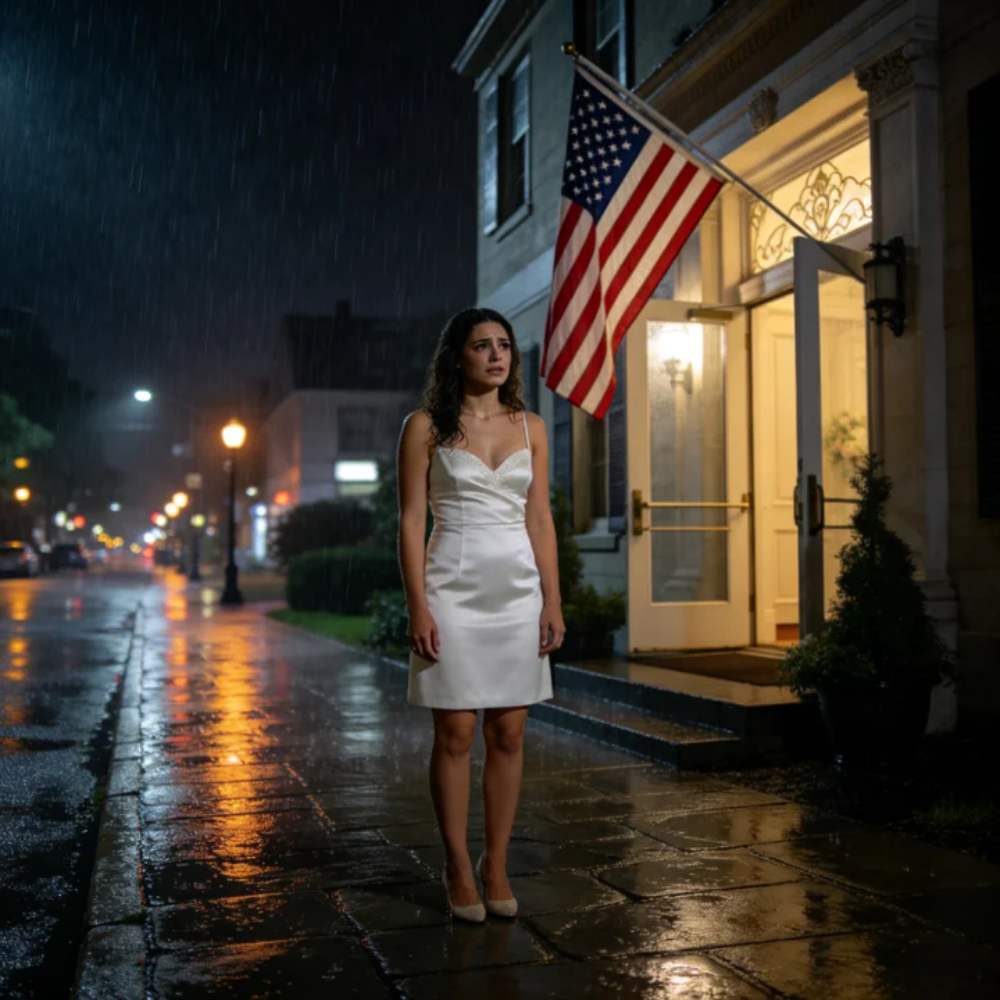 The rain came down like a curtain of needles against the yellow glow of a New Jersey streetlight, the kind of cold October rain that makes the pavement shine like polished glass and turns every sound into an echo. A black town car idled at the curb. Across the narrow street stood an elegant red-brick event hall in Hoboken, its tall arched windows dark, silent, and completely empty.