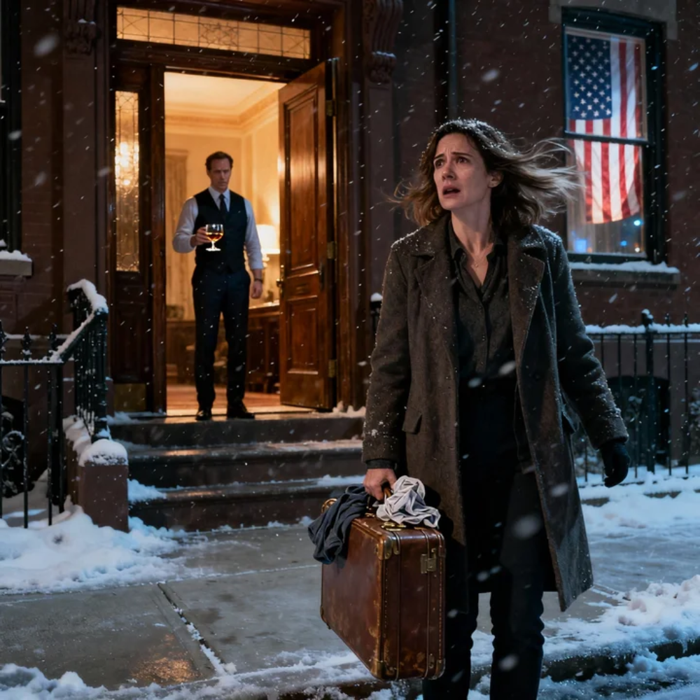 Snow fell harder as I stood on the porch hours later, my suitcase bursting open in the slush while my brother sipped cognac under warm light.