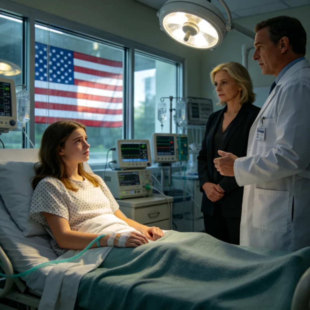 The fluorescent lights above me didn’t flicker so much as stutter, like they were struggling to stay alive, buzzing in uneven pulses that made the entire hospital room feel unstable. It was the kind of room you find in a mid-sized American hospital somewhere off a highway exit—maybe Ohio, maybe Indiana—where everything smells faintly of disinfectant and overbrewed coffee, and the air conditioning is always just a little too cold. Outside the narrow window, I could see a gray parking lot dotted with pickup trucks and sedans, the kind of place where people came for emergencies, not miracles.