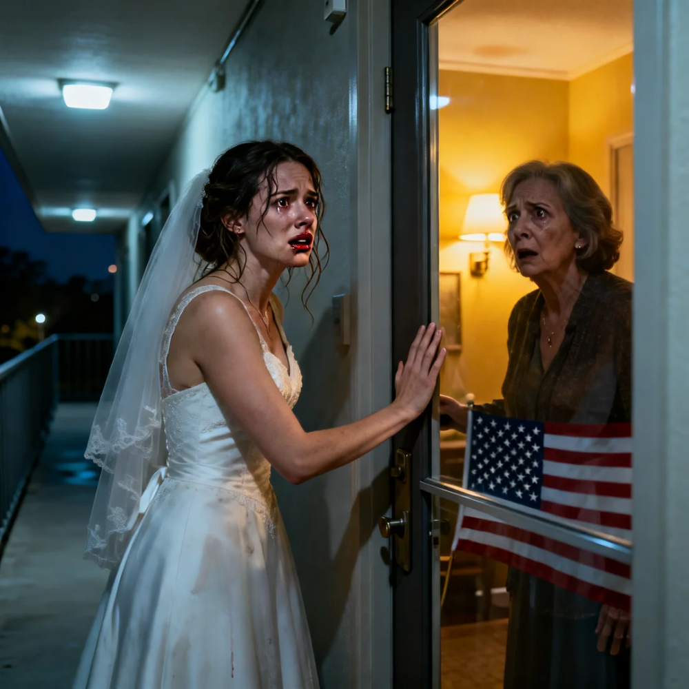 Only hours earlier that dress had been ivory satin, fitted through the waist, elegant and soft in the way she had always imagined. Now it was streaked, wrinkled, smeared dark at the hem and along one side, the fabric hanging off one shoulder where the seam had come loose. Her hair had fallen out of its pins. One side of her face was swollen. Her lip was split. There were marks across her cheek so distinct that even through the peephole I could see the shape of fingers.