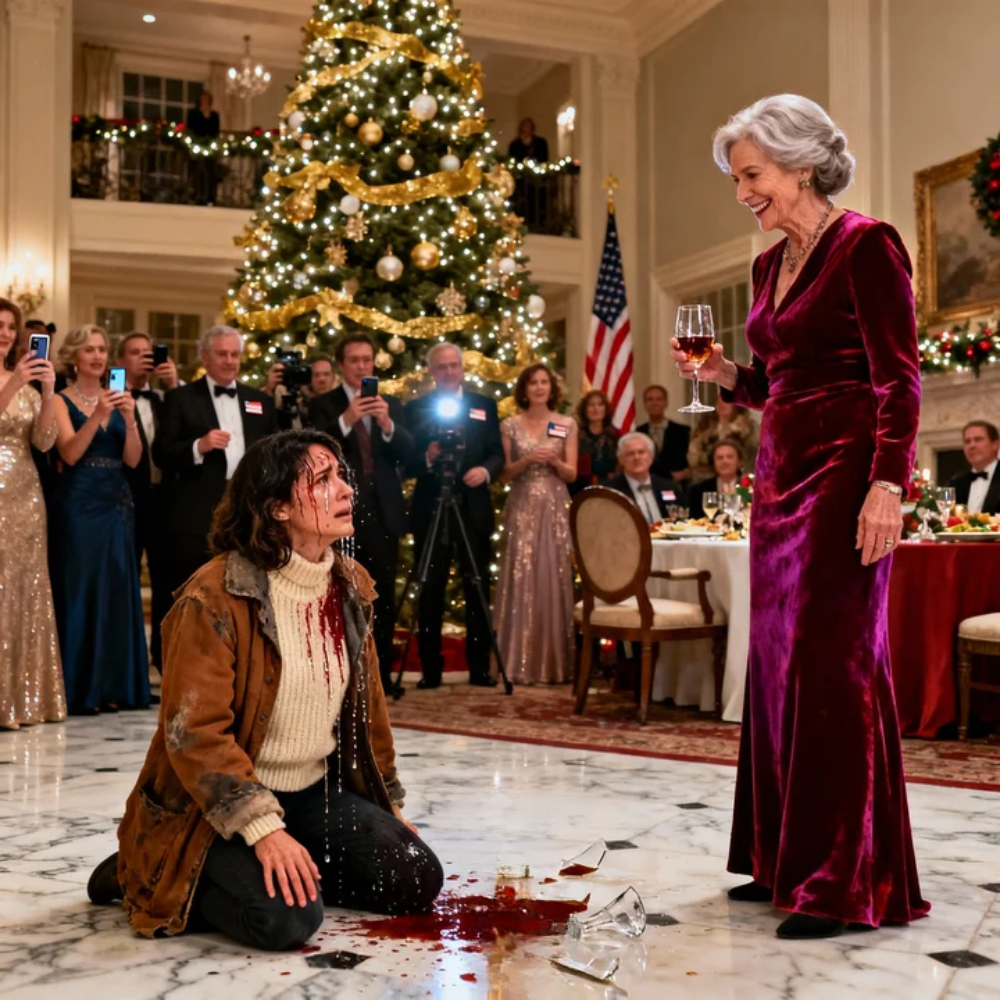 Two hundred people in a mansion that looked like it had been carved out of money itself—white columns, a chandelier the size of a small car, a Christmas tree that scraped the ceiling like it had something to prove—watched me stand there soaked, trembling, humiliated. Some of them smiled the way people smile at a viral clip they can’t wait to repost. Some of them raised their phones immediately, hungry for a story.