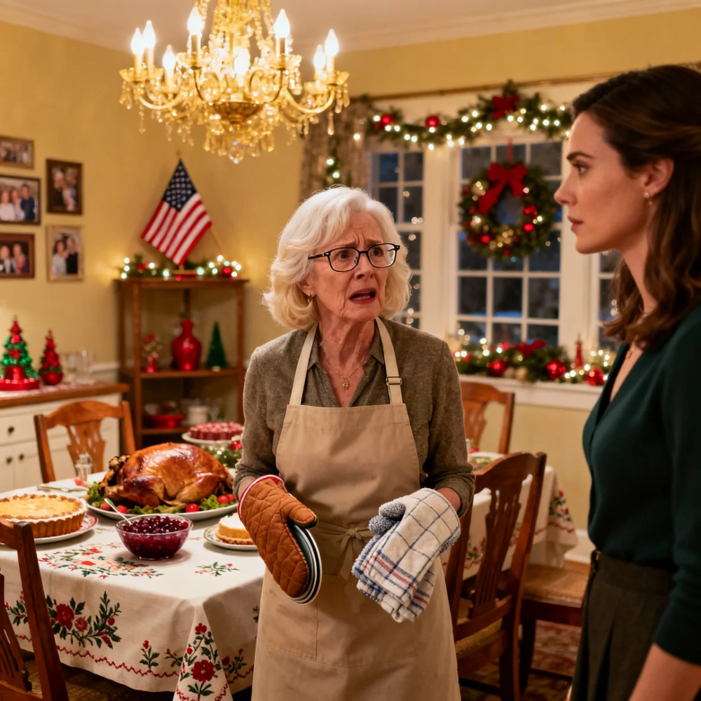 The first thing I saw that Christmas morning was my own reflection in the black glass of the oven door: a 63-year-old woman in a faded red apron, hair pinned up badly, one hand wrapped around a dish towel, the other resting on the counter she had wiped down every day for three decades, standing in a kitchen that still smelled like sage, butter, and the kind of memory money cannot buy. The turkey was browning. The cranberry sauce was cooling. Snow had feathered itself along the edge of the backyard deck sometime before dawn. The little ceramic reindeer my husband gave me during our first year of marriage was waiting in the center of the dining table exactly where I had placed it, because some things, if you are lucky, become tradition and then become part of the architecture of your life. And then my daughter-in-law looked at me with a face as calm as a bank clerk closing a file and said, “We didn’t really plan this as your thing, Beverly. You might be more comfortable upstairs.”