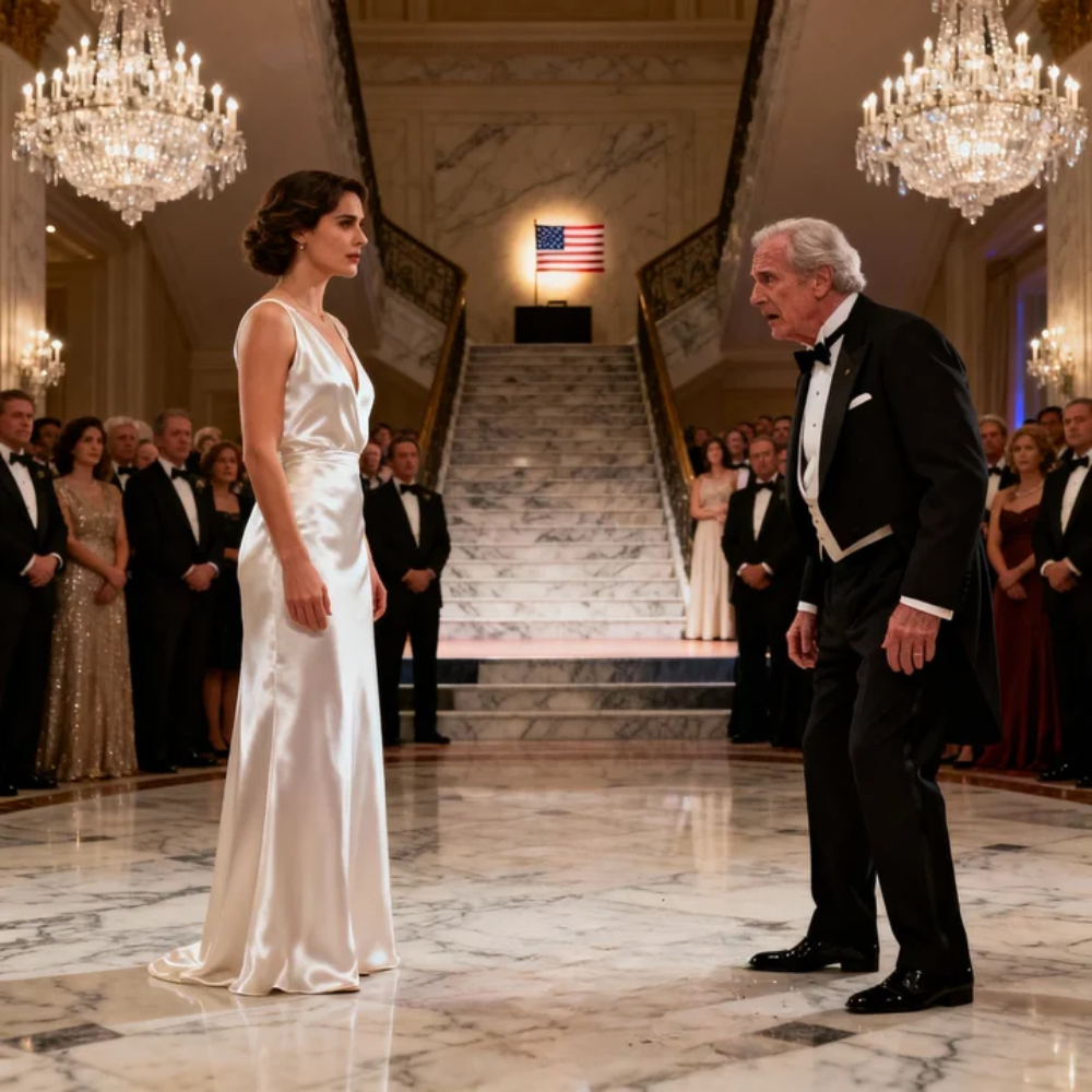 Not the music, not the clink of crystal glasses or the soft murmur of polite conversation that always hovered over rooms like this. It was the sound of heels on marble—measured, deliberate, impossible to ignore. In a ballroom built to celebrate power, wealth, and reputation, that sound cut through everything like a blade.