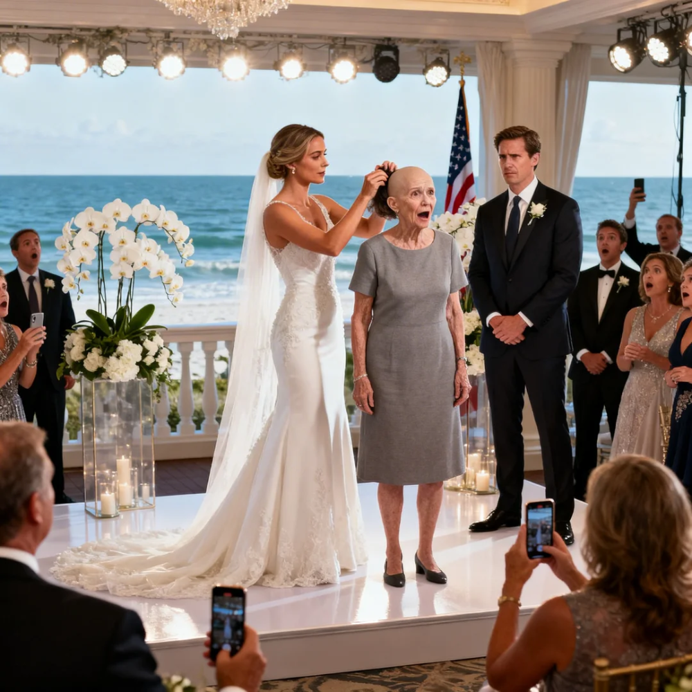 The music from the string quartet faltered for a split second as the dark brown wig slipped from her hand and fell toward the polished wooden floor. Beneath the brilliant lights stood my wife, Mary Harrison—her pale scalp exposed, the faint marks of chemotherapy visible under the glow of cameras held by two hundred well-dressed guests.