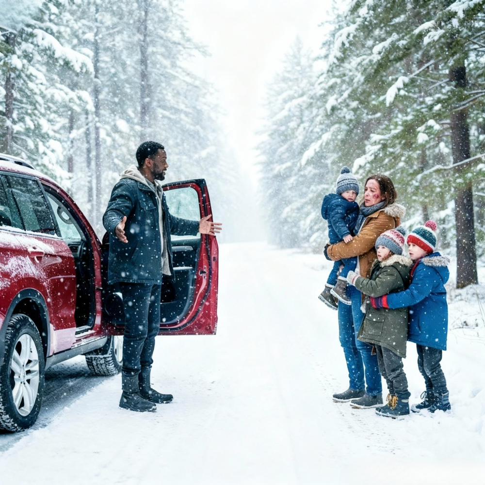 Another set of headlights slid into view behind them, an SUV barreling far too fast for the conditions, license plate flashing blue and white as it streaked past. For a split moment, the bright beams illuminated all of them—Marcus with his hands open, the woman hunched over her kids, the boy’s face slack and frighteningly still.