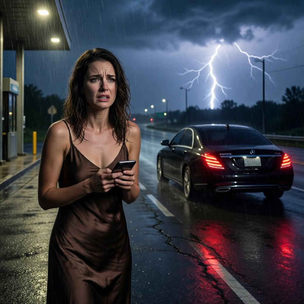 The lightning cracked across the sky like a warning written in fire, illuminating the empty stretch of highway where a black Mercedes idled for just a second too long before disappearing into the storm, leaving a woman alone on the broken asphalt of a forgotten rest stop somewhere off Interstate 95, miles from the nearest town, miles from safety, miles from the life she had spent twelve years building.