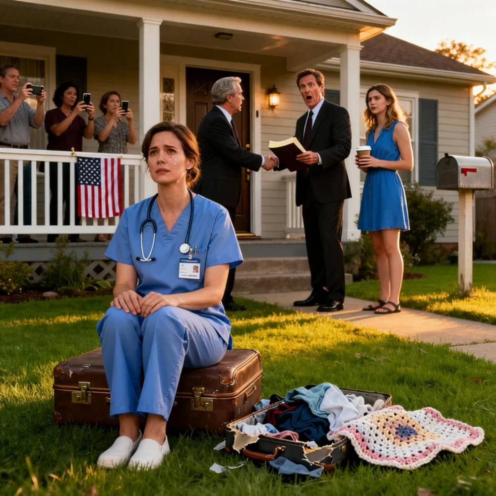 I didn’t look back up at the window again. I didn’t need to. Vanessa’s smirk could’ve burned a hole through glass, and I still wouldn’t have reacted. I walked to my suitcase, the one Derek had thrown like a statement, and sat down on it right there in the yard. Grass dampened my scrub pants. Cold seeped through the thin fabric. My work badge swung slightly, catching light like a small, stupid reminder that I’d spent the day saving strangers while my own life was being dismantled on my front lawn.
