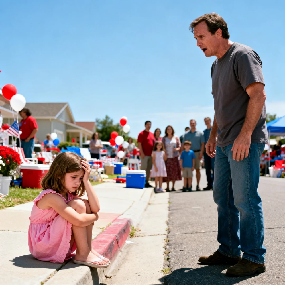 Hannah sat alone on the curb between two strangers’ lawn chairs, hugging her knees like she was trying to make herself smaller. Her little flag lay on the ground beside her. The stick was snapped. Her cheeks were wet but she wasn’t sobbing—she was blinking hard, holding the rest back with sheer will.