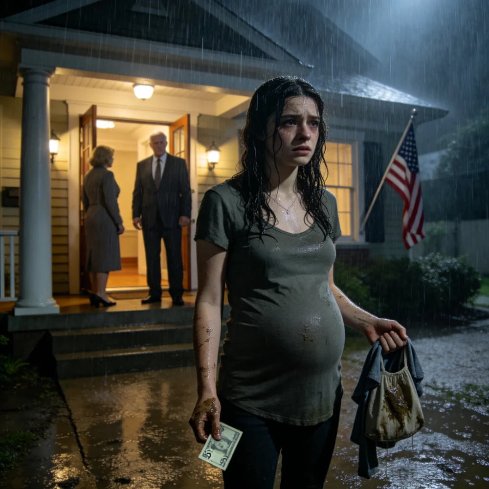 When I opened the front door, the rain hit the porch in silver sheets, cold and punishing and so loud it made the whole neighborhood vanish. I stepped outside, barefoot in the wrong shoes, one hand gripping the trash bag, the other clenched around the money. Then the door shut behind me.