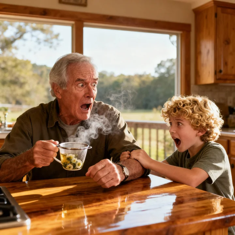 “Grandpa,” he said, and it wasn’t a whisper. It wasn’t a croak. It was a real word, placed carefully, like he had been saving it. “Please… you can’t drink that.”