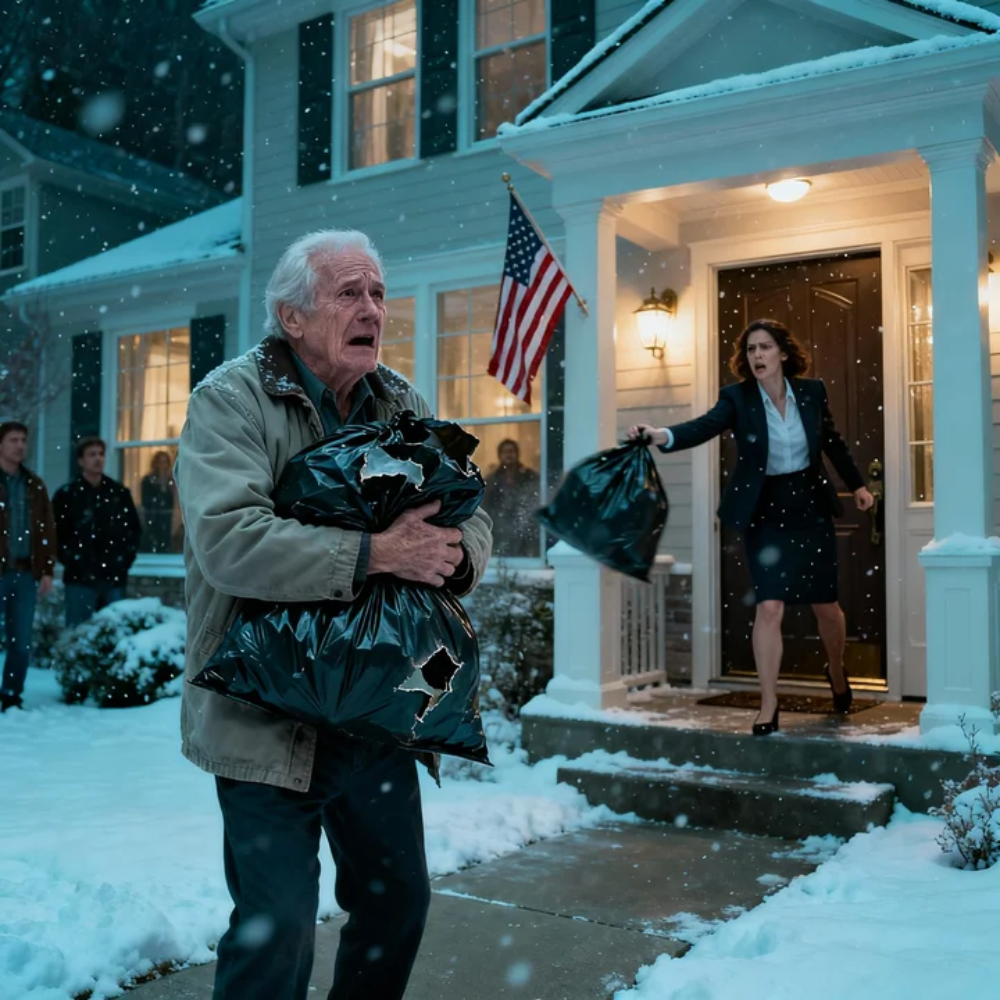 A wet, hollow thud echoed across the quiet suburban street as my leather suitcase slammed into the driveway, splashing icy slush onto my pant legs. It was the same suitcase I had carried through airports, hospitals, and decades of life, and now it lay there like a discarded animal. Then came the second blow—not a sound this time, but an impact. Something heavy crashed into my chest, knocking the air from my lungs and forcing me back a step as freezing rain soaked through my coat.