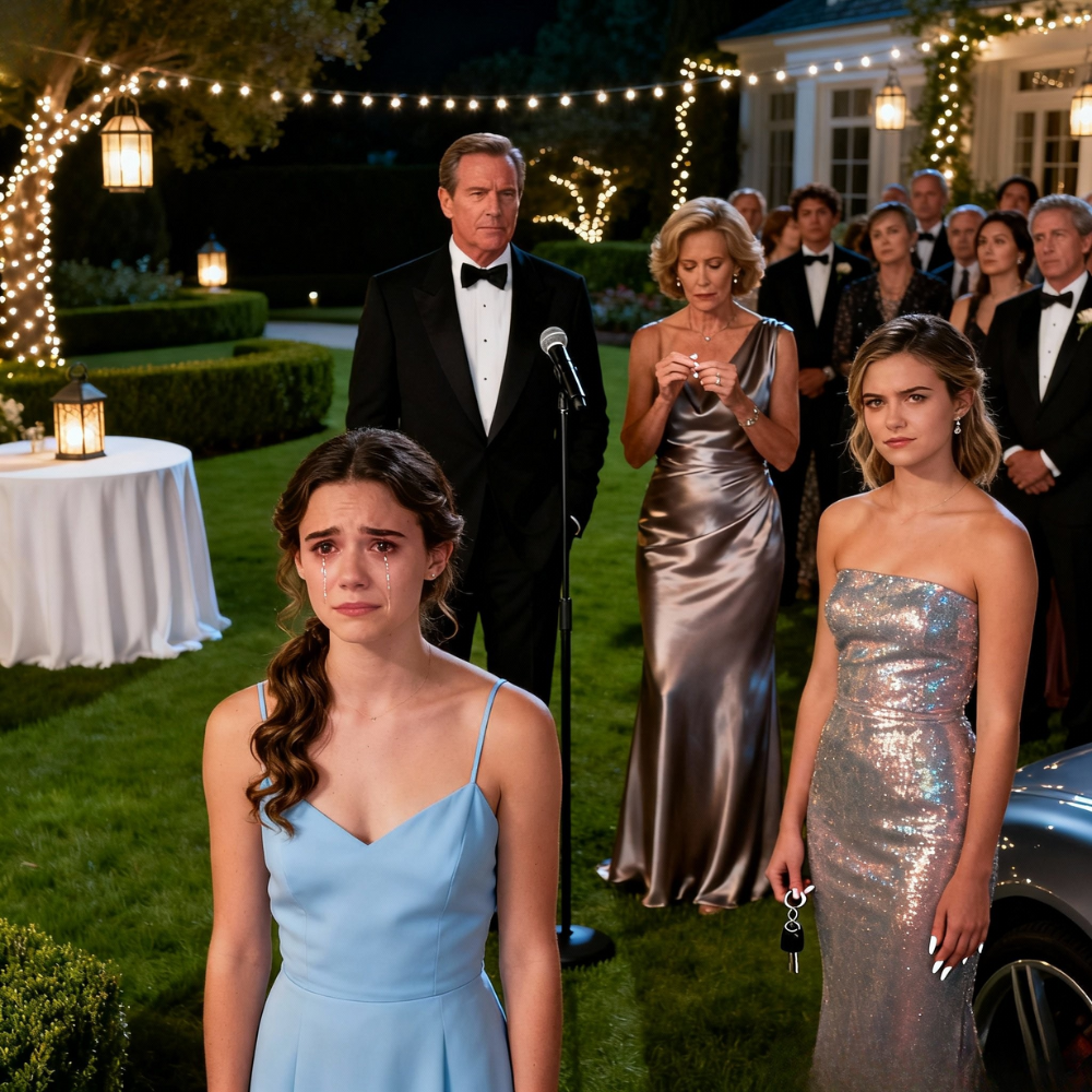 My father, William Harper, tapped the stem of his champagne flute with the side of a knife, the sound sharp and commanding under the fairy lights strung through the oak trees. Beyond the hedges, the flag on the pole by the circular driveway stirred lazily in the warm New York night, red and white stripes glowing faintly against the dark.