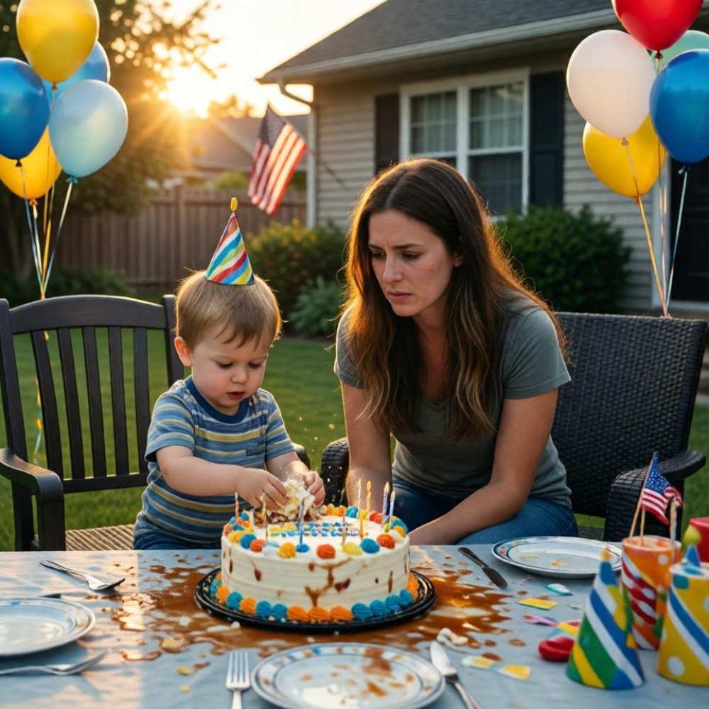 Meanwhile, my son sat in his high chair, smashing frosting into his own cheeks with both hands, laughing at something only he could understand, looking around at faces that loved him, but still—every now and then—turning toward the gate like he was waiting for someone else.