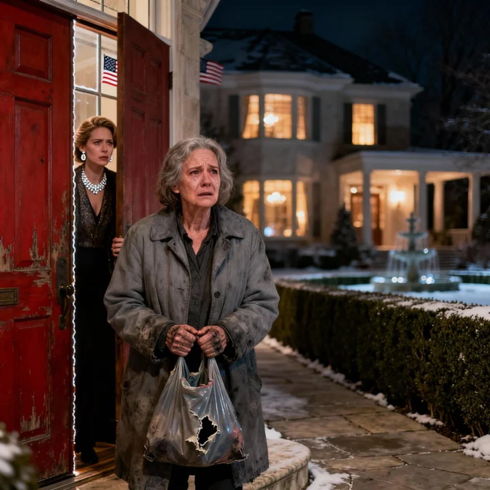 The first snow of February came down in dirty, wind-driven sheets, turning the streetlights into hazy halos and the sidewalks into slick ribbons of ice. A woman in a frayed gray coat stood on a spotless stone walkway in a gated neighborhood where the lawns were trimmed like velvet and the mailboxes looked like they belonged in a showroom. Her hands trembled—not just from the cold, but from the sound that had just ripped through her chest.