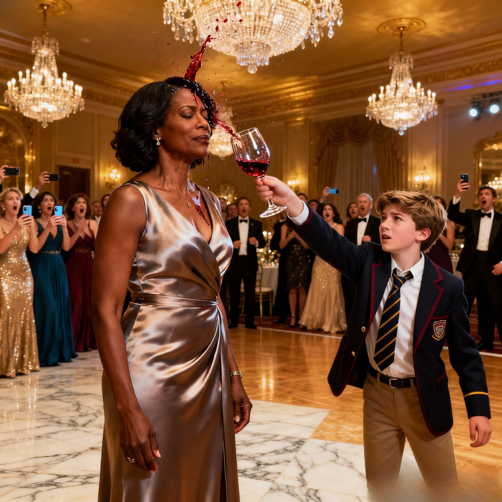 The flash of crystal caught the ballroom lights first—sharp, glittering, almost cinematic—like a still frame cut from a high-budget American drama. Then the goblet tipped. Red liquid cascaded downward in slow motion, catching every glint of the chandelier glow before it crashed across Aya Morton’s face. Gasps rippled through the Harrington Foundation Centennial Gala in downtown Washington, D.C.—a night meant to celebrate innovation, philanthropy, and the polished perfection of old-money elites. Instead, it froze in place as a fourteen-year-old boy smirked into the cameras.