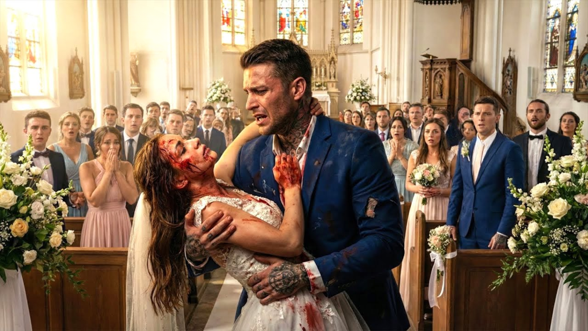 Then everything collapsed—her vision, her posture, her body—falling hard against the marble floor. Her bouquet scattered across the ground, white petals sweeping outward like a snowstorm caught in midair.