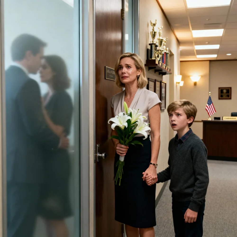 White lilies—quiet, expensive, “appropriate”—slipped against her palm as she stood outside the frosted-glass door marked RICHARD CARTER, CEO. Her wedding ring felt heavier than the flowers. Beside her, Lucas—twelve years old, all sharp observation and swallowed questions—pressed his shoulder into her hip the way he used to when he was little and the world felt too loud.