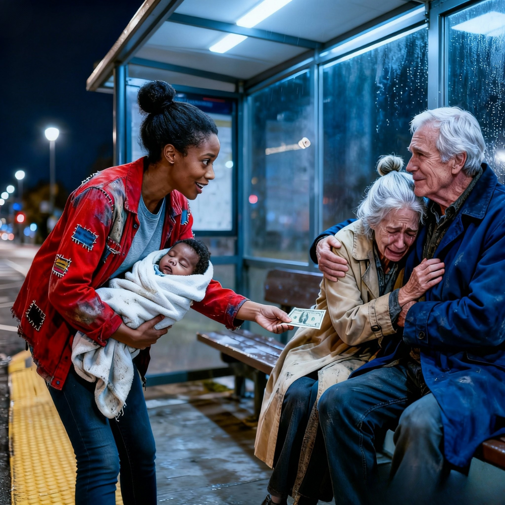 At the far end of the stone bench inside the bus shelter, hunched together under the flickering light, sat an elderly couple. Their hair was white, not soft movie-white but the thin, fragile kind that comes with age and worry. The woman’s face was buried in the man’s shoulder, her shoulders shaking. The man had his arm around her, his eyes closed, tears trailing down the lined grooves of his cheeks.