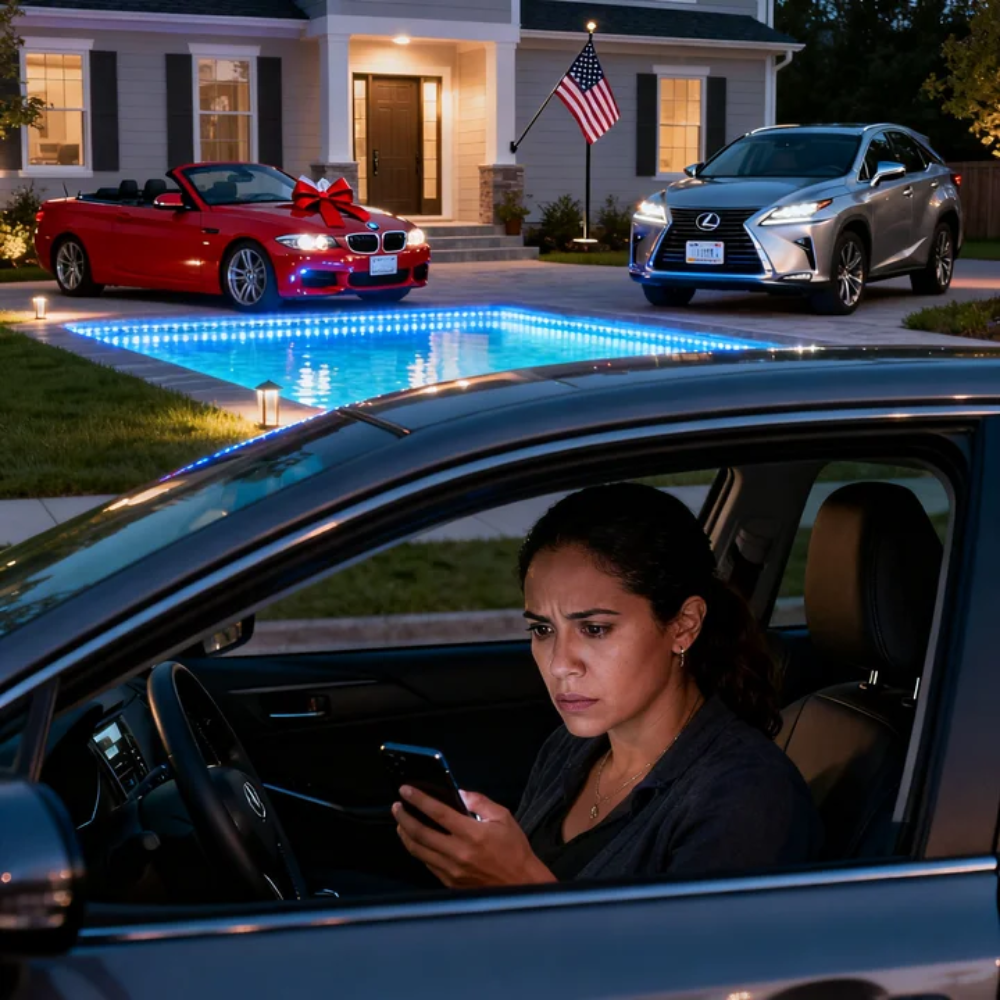 Where my father’s dented 1998 Camry used to sit was a silver Lexus SUV with temporary tags. Parked beside it, gleaming under the Maryland sky, was a red BMW convertible with a bow still taped to the hood. In the backyard, visible through the open gate, a brand-new infinity-edge pool shimmered with LED lights that must have cost more than my entire annual grocery budget.