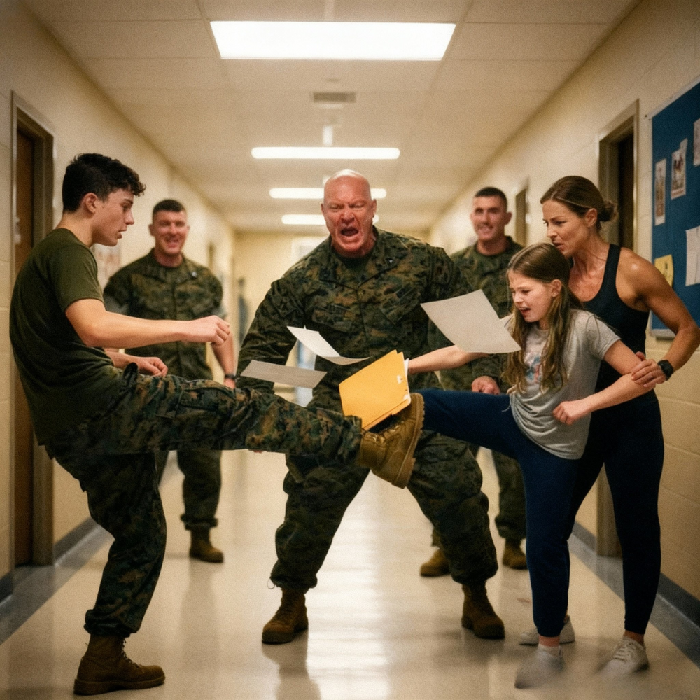 They thought no one was watching when the kid’s shin took the hit. Just a quick, calculated tap of a sneaker against bone in a quiet American hallway, under a buzzing strip of fluorescent light and a faded poster about kindness peeling at the corners. There was no camera angle, no dramatic soundtrack, just a twelve-year-old girl on the tile floor of a California middle school, clutching a bent folder while four adults in Marine Corps base IDs laughed like it was all a joke. Out by the street, the Stars and Stripes fluttered on a rusted flagpole above a parking lot full of pickup trucks and SUVs. Inside, in a hallway that suddenly felt too long and too empty, someone decided she was an easy target. Someone else decided to kick her for telling the truth. And the woman they said didn’t exist was still ten steps away from the door.