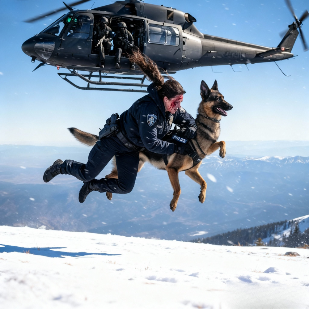 Beside her, a German Shepherd struggled in the snow, one hind leg bleeding, body trembling with pain and adrenaline. The dog tried to stand, failed, growled—not at Ethan, but at the world, at the hurt, at the fact that it couldn’t do its job to protect her.