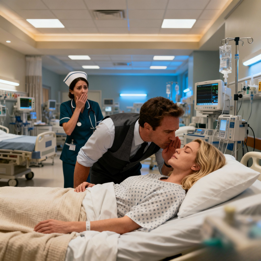 Imagine a single photograph: a storm-gray morning over downtown Chicago, the skyline a jagged line of steel and glass, and in the center of the frame—behind a hospital window blurred by condensation—a woman lies motionless in a VIP suite. The city looks alive, fast, greedy, indifferent. Inside that room, Eleanor Vance opens her eyes and instantly understands something irreversible has shifted. The United States never pauses for anyone, not even for the woman who built an empire of high-end wellness clinics catering to the wealthy elite from New York to California. But the air around her bed feels charged, uneasy, as if the staff themselves sense the fragile line between life and death tightening. She hears footsteps in the hallway outside her private room, voices low but not low enough to escape her trained ear. Eleanor, known in the business world for listening more sharply when she seemed distracted, lets her eyelids fall to narrow slits. She recognizes the weary cadence of Dr. Simon Hayes, Chief of Medicine, speaking to her husband, Matthew. Her husband’s voice is tense, almost cracking, though Eleanor knows better than anyone how quite controlled Matthew’s emotions usually are. She has spent years studying people, evaluating character, choosing associates and eliminating threats. And now she listens to the man who once held her as if she were the center of his world.