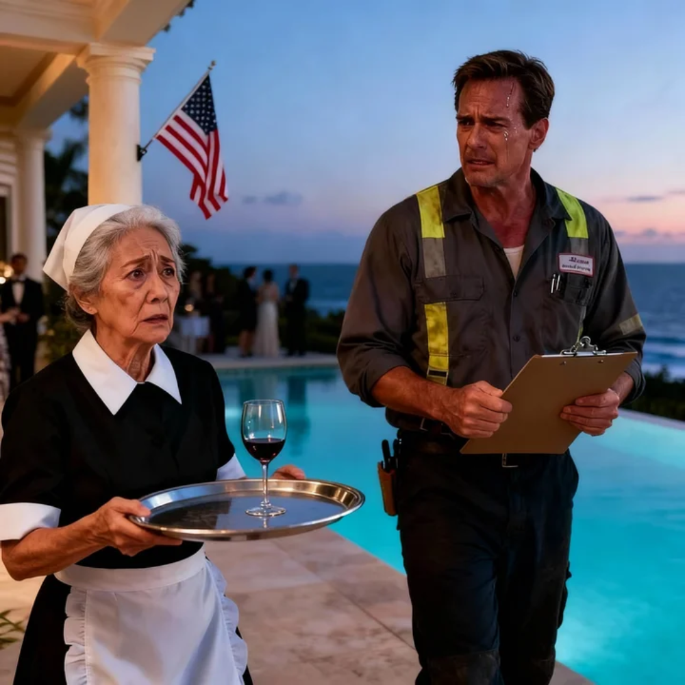 She stood at the edge of an infinity pool that spilled into the Pacific like a mirage, a silver tray trembling in her hands. Champagne flutes chimed. A playlist thumped low and lazy. People in designer swimwear lounged like they owned the sky. And there was my mother—Emma Reed, seventy-eight years old, shoulders narrow as a hanger—wearing a black-and-white service uniform in the waterfront mansion I’d bought her with my first serious payout fifteen years ago.