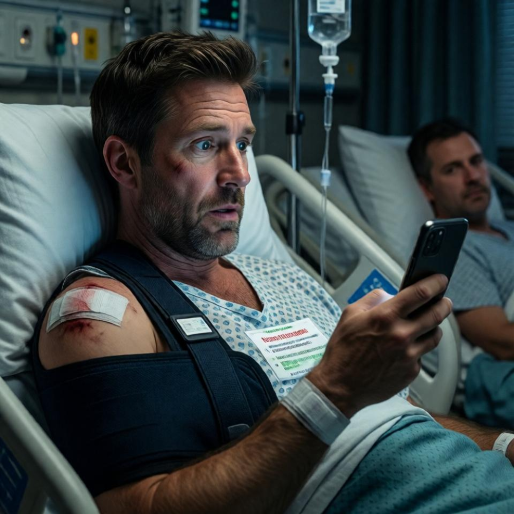 The phone did not ring so much as shiver against Ryan Thompson’s palm like a trapped insect, its weak vibration swallowed by the rough cotton blanket tucked across his hospital lap, and for one disoriented second, in the antiseptic light of a Thursday morning that smelled of bleach, overcooked eggs, and the stale chill of overworked air-conditioning, he thought it might be a message from the orthopedic unit downstairs, maybe a reminder about imaging, maybe an update about physical therapy, maybe some small administrative thing from Mercy General that belonged to the ordinary machinery of pain and recovery. Outside the narrow window of the room, a slice of gray winter sky hung over downtown Columbus, Ohio, and a line of half-frozen rain crawled down the glass. Inside, his left collarbone was splinted, three ribs were cracked on the right side, his shoulder burned with every breath, and the narcotics still moved through his bloodstream in slow, muddy waves. Nothing in that moment suggested a second impact was about to land harder than the first.