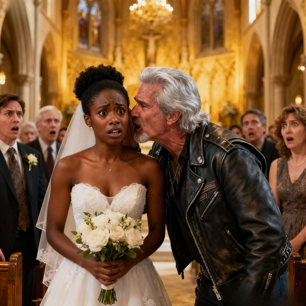 When she reached the altar, the biker leaned subtly, almost as if he were adjusting his stance, and murmured in a tone that could have easily been mistaken for a fatherly blessing.